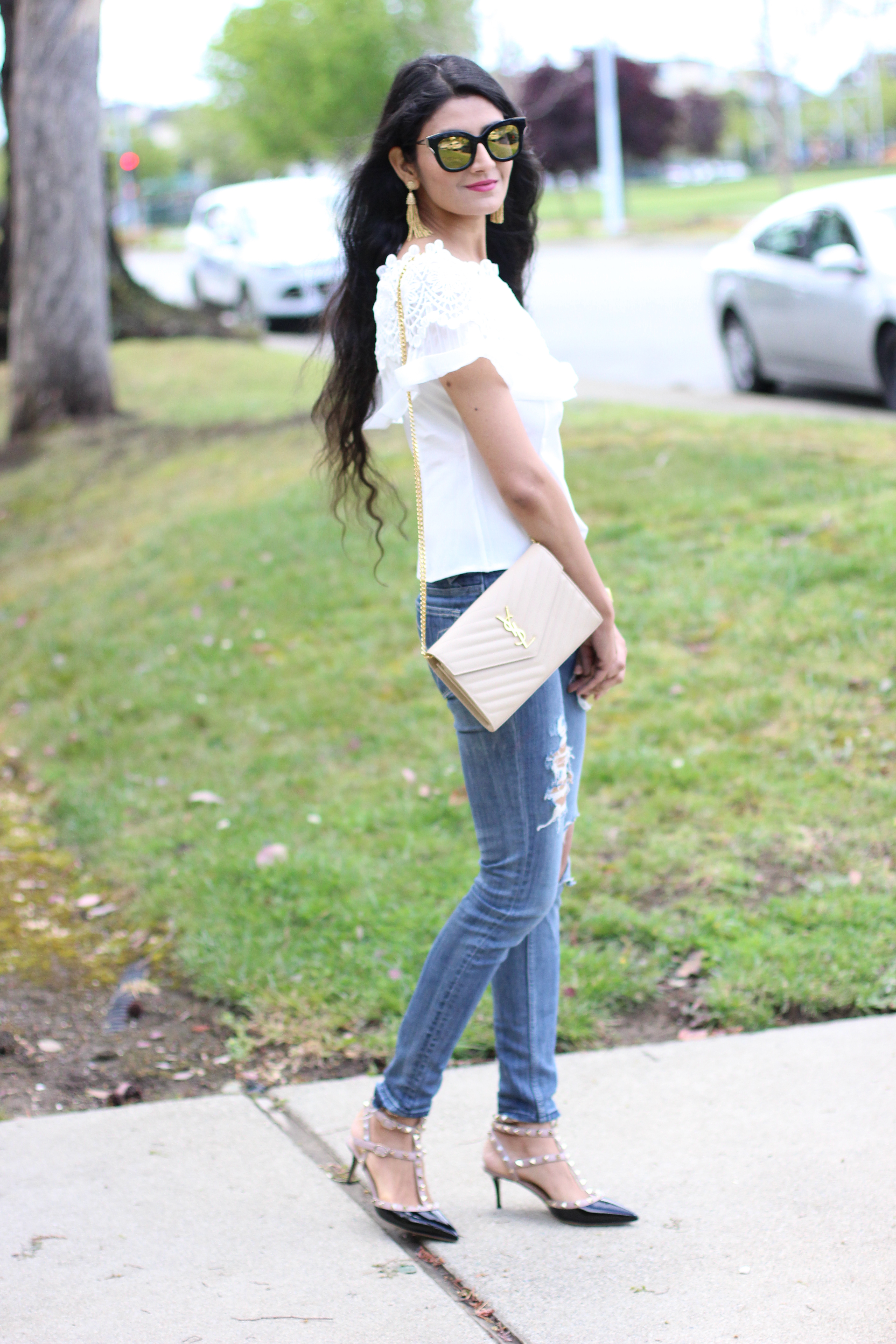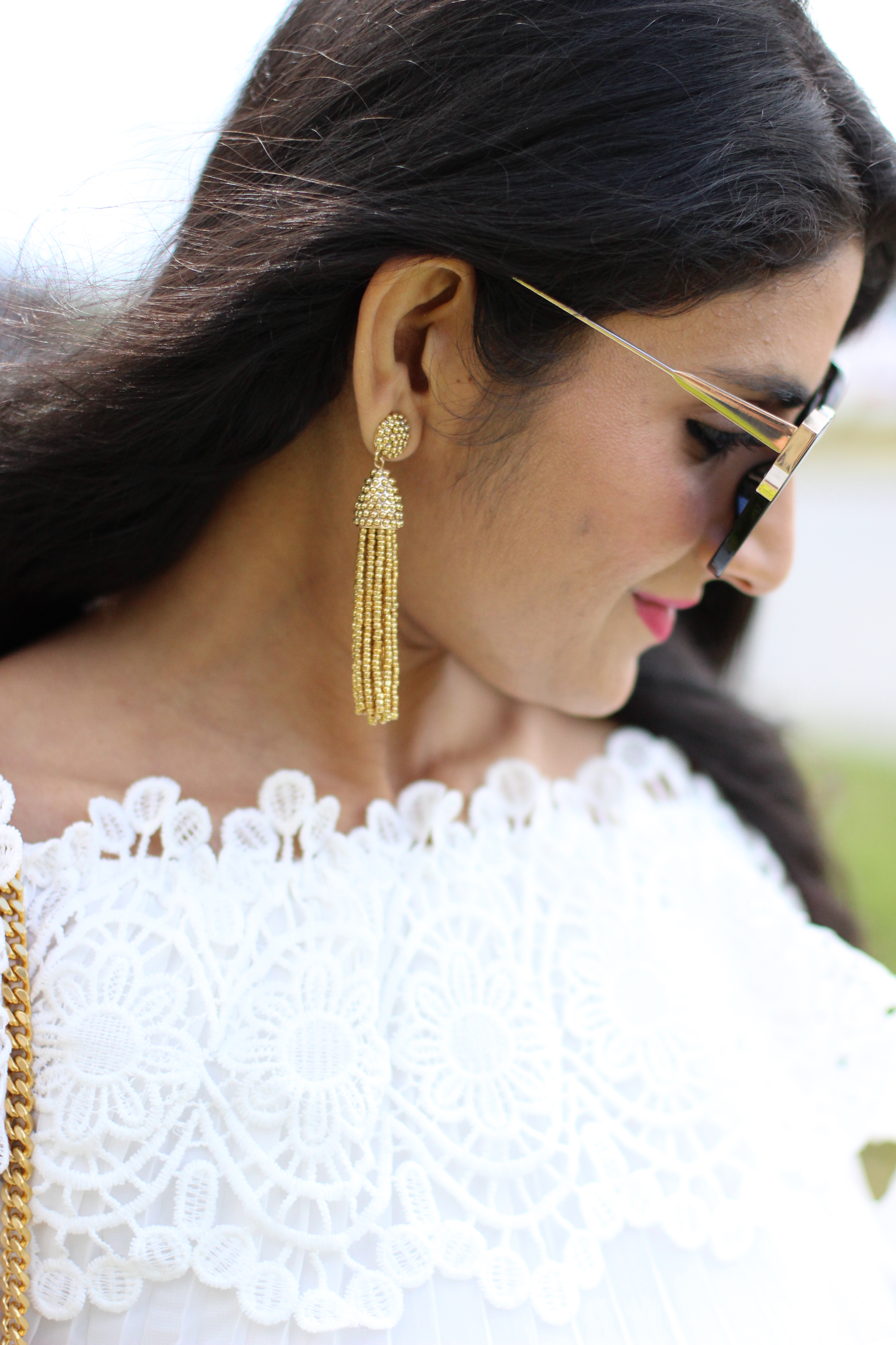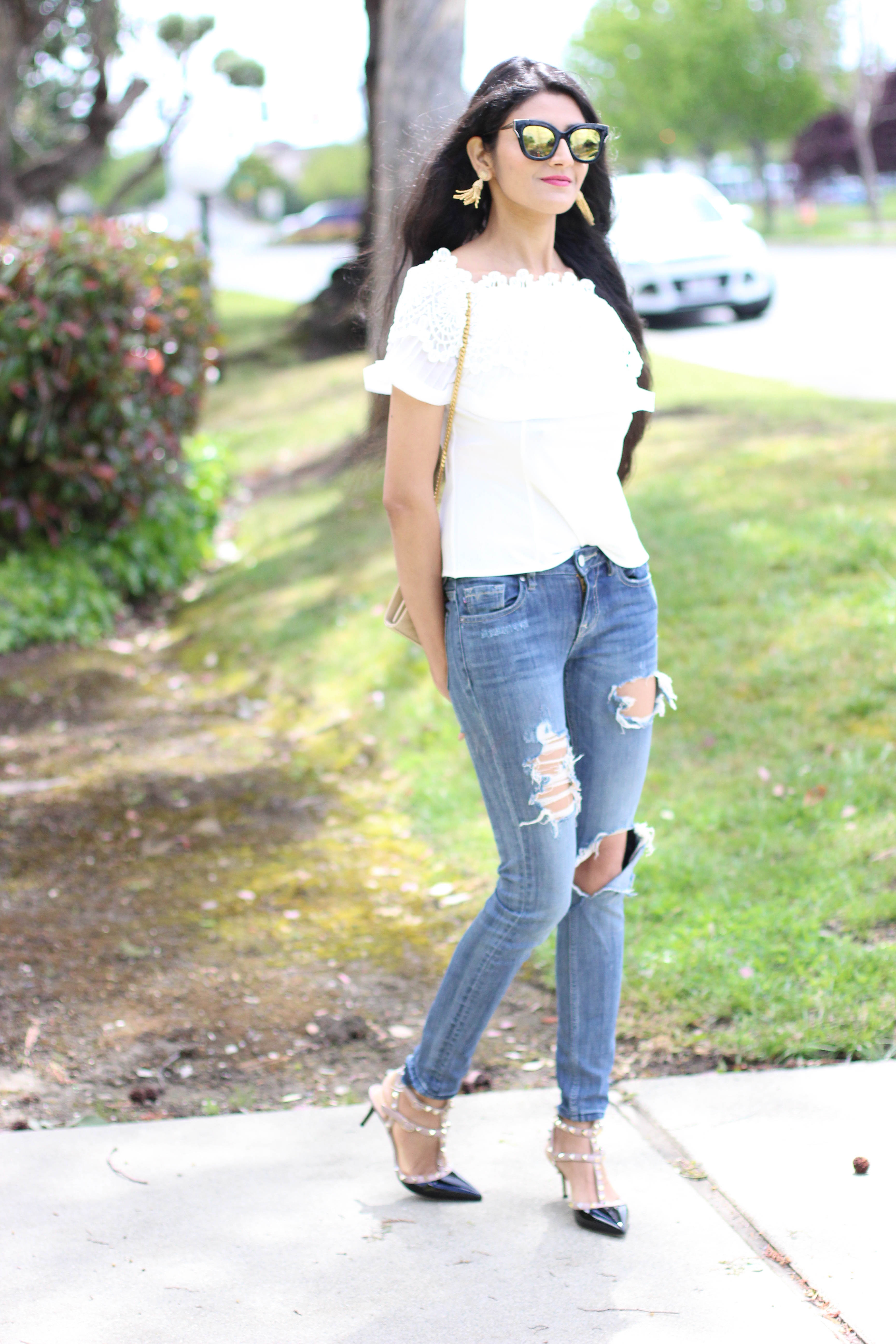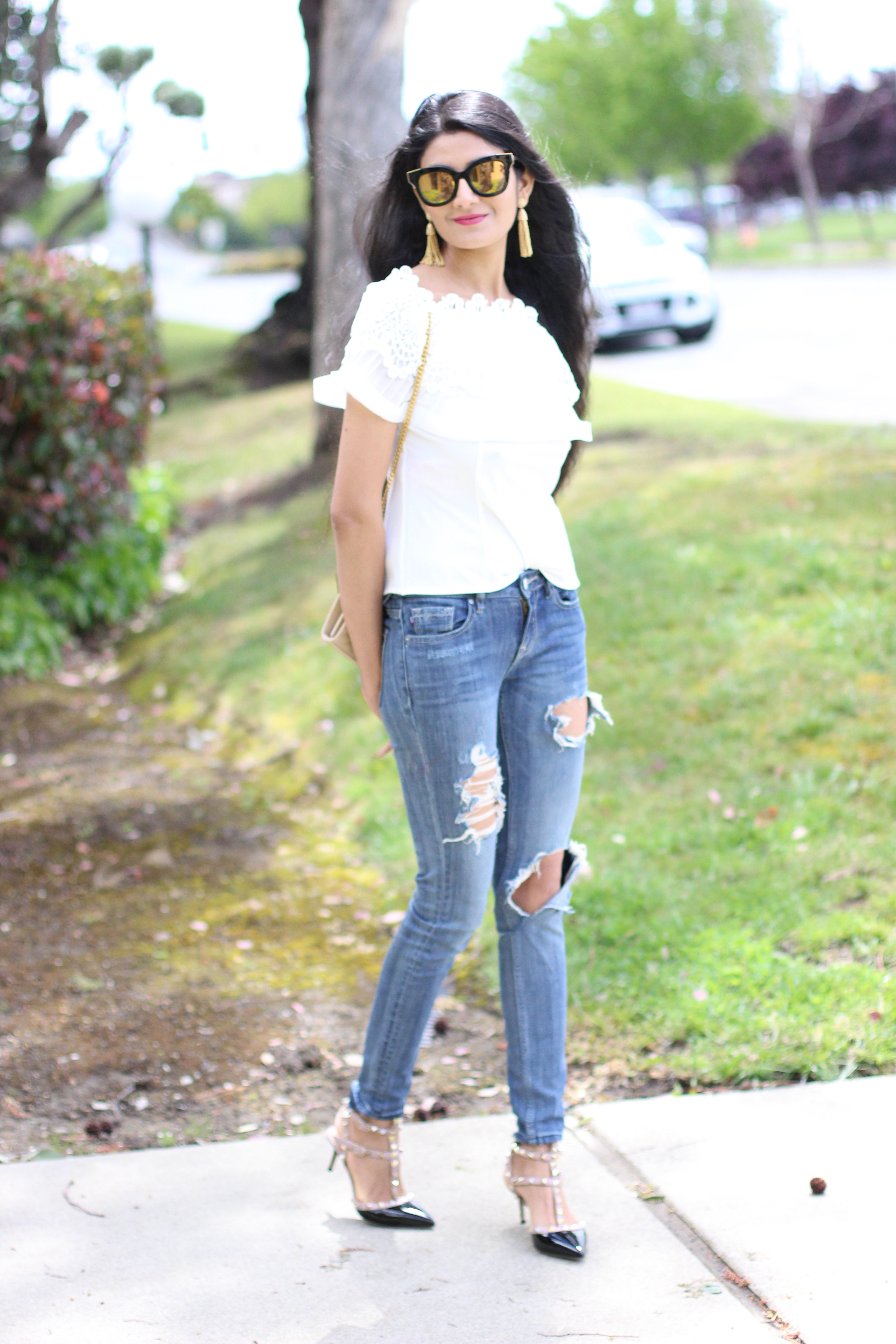 It has been windy & cold lately but spring is in the air. I am ogling over pink cherry blooms everywhere, so pretty to watch for hours. Back to the outfit, its the classic combination blue & white. The crochet details on the top make me nostalgic as I wanted to learn crochet from my grandmother. ,a little I learnt. The crochet trend is seen everywhere especially dresses and swimsuits. And one more addition to the top ,you can convert this to off shoulder..Isn’t it amazing..? You would love the price as well its under $30..beauty it is ! And to finish off the look these tassel earrings are must have for spring!
